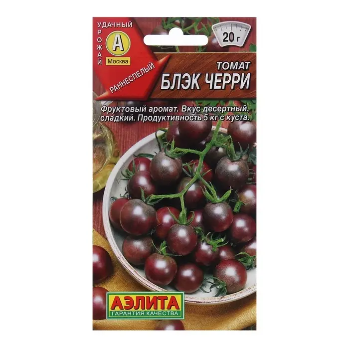 Семена Томат Блэк Черри. Раннеспелый черри для открытого грунта и теплиц. От всходов до начала плодоношения 100-110 дней. Растения индетерминантные. Высота в теплице 2-3 м, в о/г 1,3-1,6 м. Плодоношение обильное и очень длительное – до морозов. В сложных кистях формируется по 25-40 плодов. Масса томата в о/г 8-10 г, в теплице – до 20 г. Вкус десертный – сладкий, насыщенный, с фруктовым ароматом. Урожайность под пленкой 8-10 кг/м2. Агротехника. Растения подвязывают и формируют в 1-2 стебля. Обязательным является удаление пасынков и старых нижних листьев. Для консервирования плоды снимают в фазе бланжевой спелости. Необходимо беречь кисти от заломов.