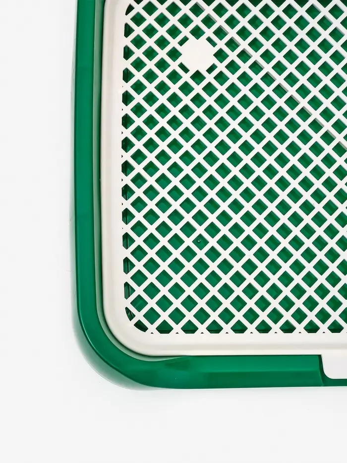 - Съёмная решётка: пластиковая сетка удерживает лапы над наполнителем или впитывающей пелёнкой. Её можно легко снять для чистки — никаких брызг и разносимой грязи по дому.