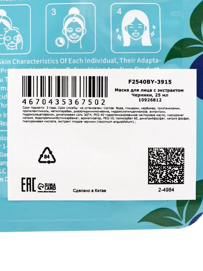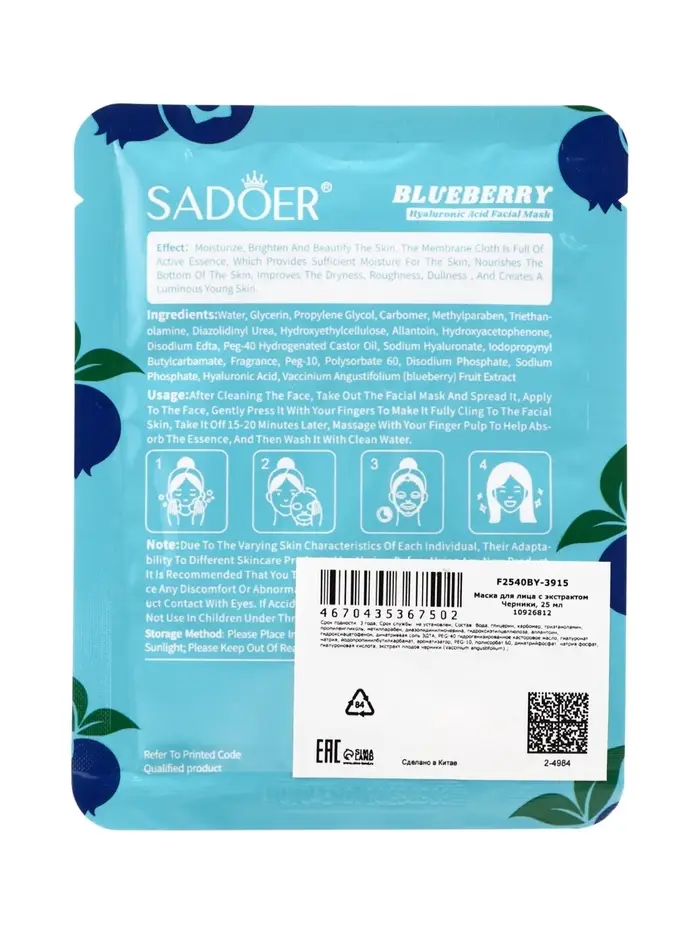 Маска тканевая увлажняющая для лица c экстрактом черники, 25 мл
