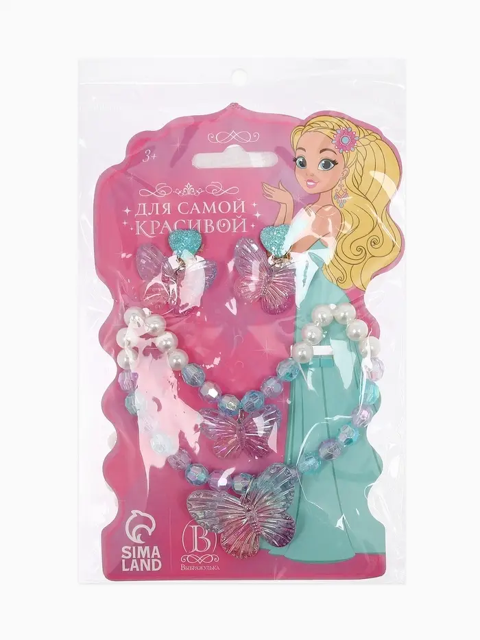 Набор детский «Выбражулька» 4 предмета: бусы, браслет d=6 см, клипсы, кольцо, бабочка