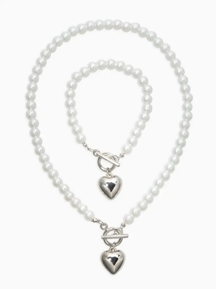 Набор 2 пред-та: бусы.браслет "Жемчуг", сердце, цвет белый в серебре L=18/42см №8