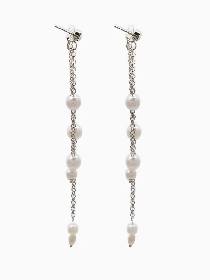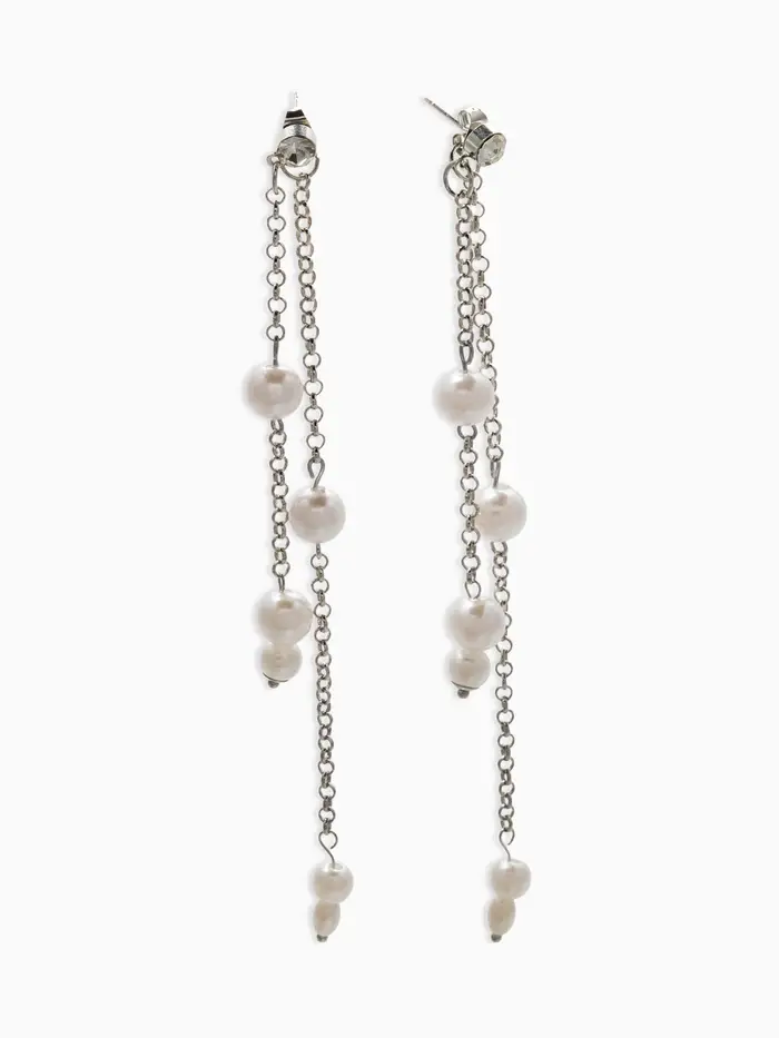 Серьги жемчуг "Цепочки" двойные, цвет белый в серебре