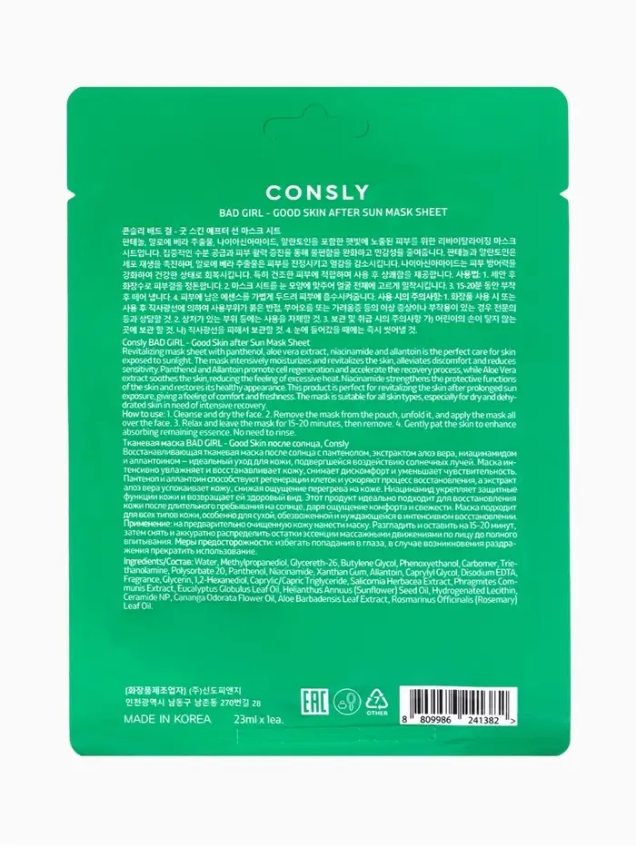 Тканевая маска Consly «После солнца» создана для ухода за кожей, которая нуждается в восстановлении после воздействия солнечных лучей и внешних стресс‑факторов. Это средство помогaет интенсивно увлажнить кожу, уменьшить ощущение дискомфорта и чувствительности, вернуть мягкость и ощущение комфорта коже, перегретой или пересушенной после пребывания на солнце. Маска подходит для всех типов кожи, особенно для сухой, обезвоженной и склонной к раздражению после длительного пребывания на солнце.