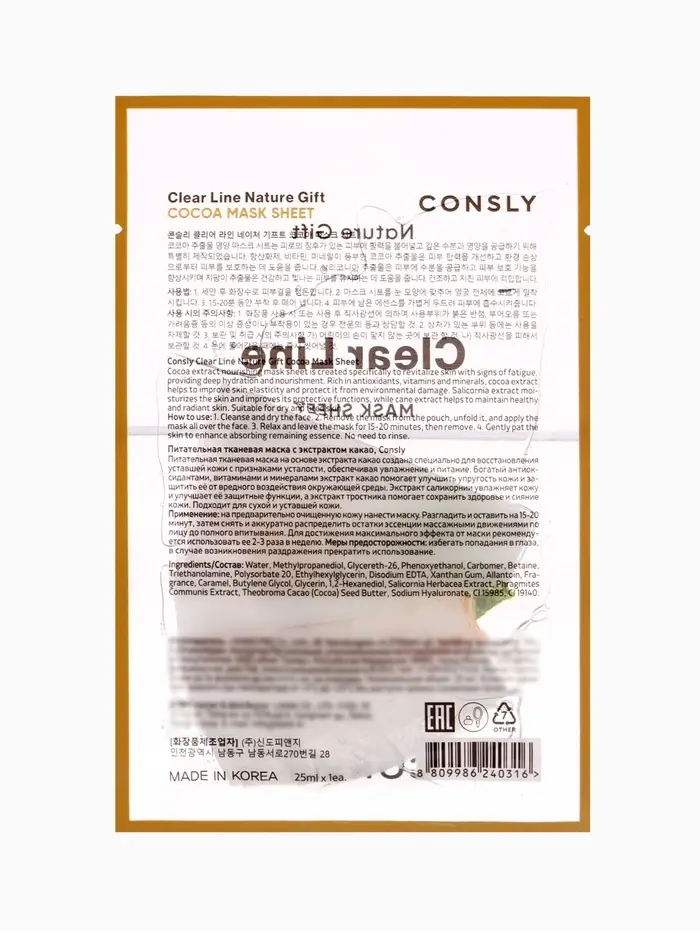 Тканевая маска Consly на основе экстракта какао создана для интенсивного увлажнения, питания и восстановления уставшей кожи лица. Экстракт какао богат антиоксидантами, витаминами и минералами, которые помогают коже укреплять защитный барьер, защищать её от неблагоприятного воздействия окружающей среды и поддерживать оптимальный уровень влаги. Такая формула способствует улучшению упругости, мягкости и общего состояния кожи, особенно если она выглядит тусклой или потерявшей тонус. Богатый питательными веществами экстракт какао усиливает способность кожи удерживать влагу и делает её более гладкой и увлажнённой после использования.