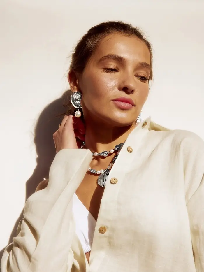 - Цветовая палитра: Акцентированное сочетание жемчужного белого и нежно-серебристого оттенков создаёт мягкий, располагающий образ, подчёркивая естественную красоту лица и кожи.
