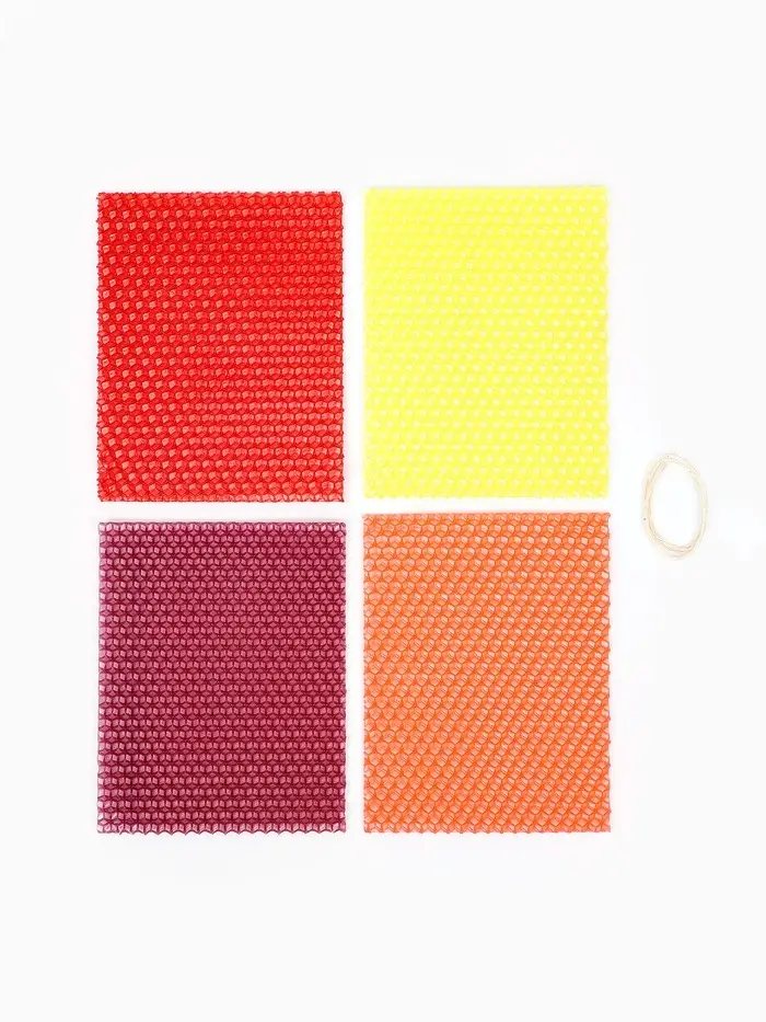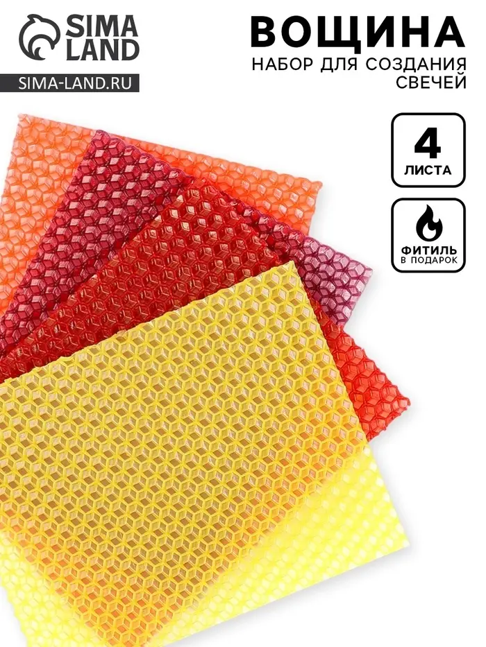 Цветная вощина представлена в четырёх оттенках, легко поддаётся формированию и декорированию, что делает процесс создания свечей простым и увлекательным даже для начинающих. В комплект входит фитиль, благодаря чему можно сразу приступить к работе без необходимости приобретать дополнительные материалы.