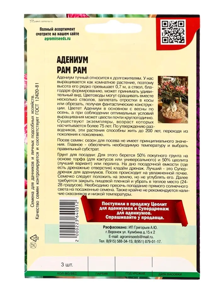 Семена цветов Адениум Pam Pam 3 шт. 12.29 г.