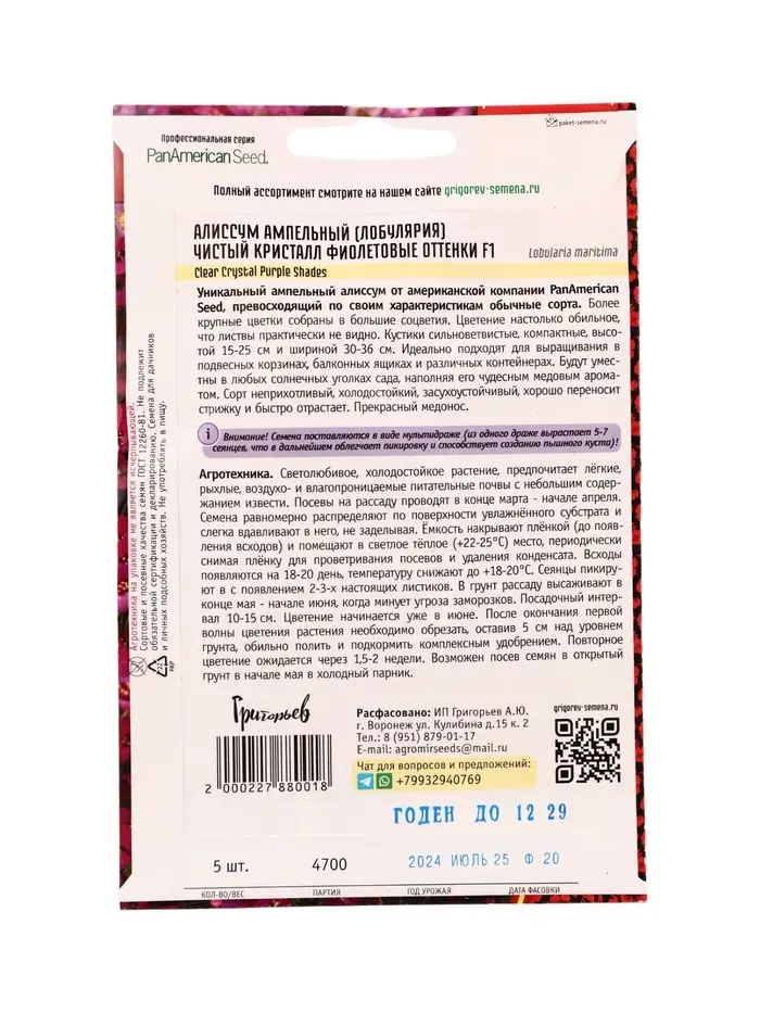 Семена цветов Алиссум Чистый Кристалл Purple Shades F1 (Clear Crystal) 5м.др. 12.29 г.