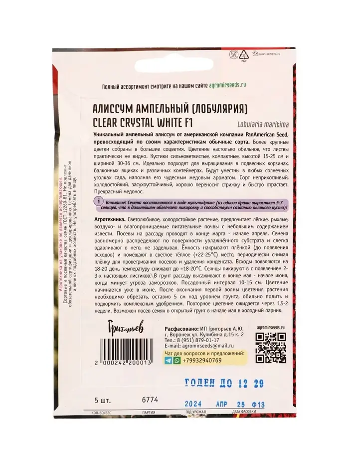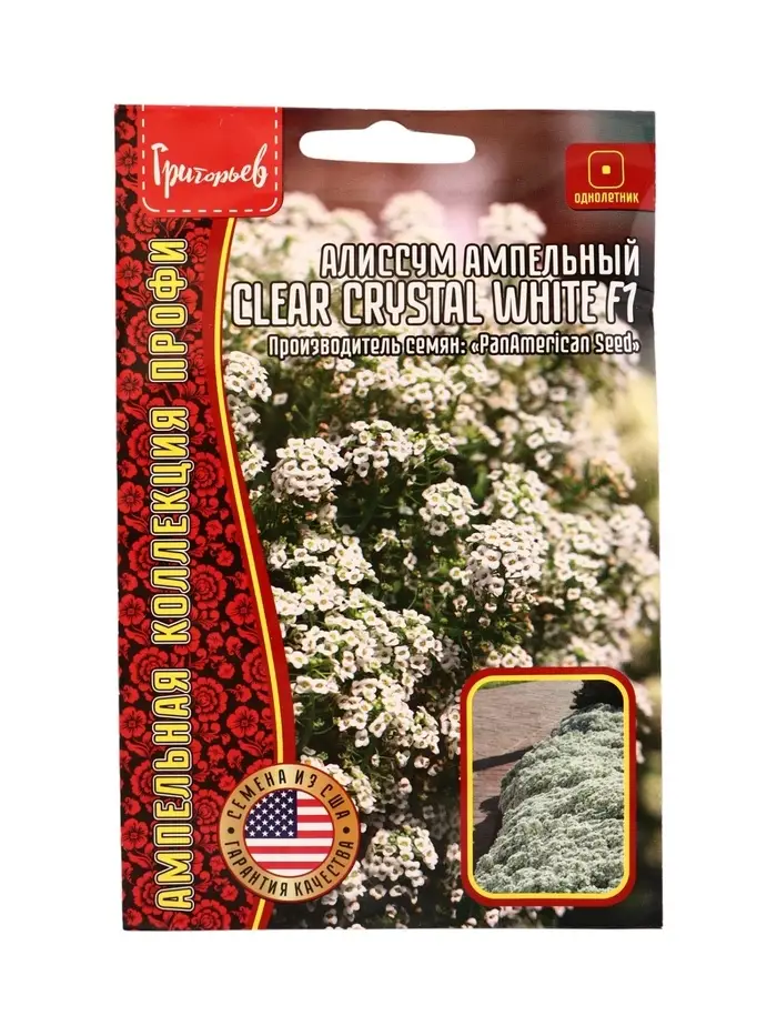 Семена цветов Алиссум Чистый Кристалл White F1 (Clear Crystal) 5м.др. 12.29 г.