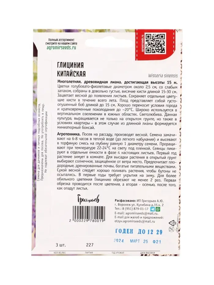 Семена цветов Глициния Китайская 3шт. 12.29 г.