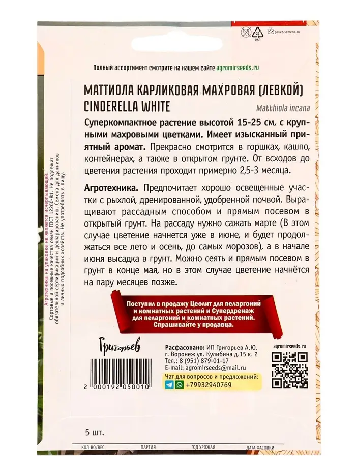 Семена цветов Маттиола Cinderella White карликовая 5шт. 12.29 г.