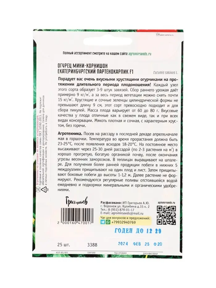 Семена Огурец Екатеринбургский Партенокарпик F1 25 шт. 12.29 г.