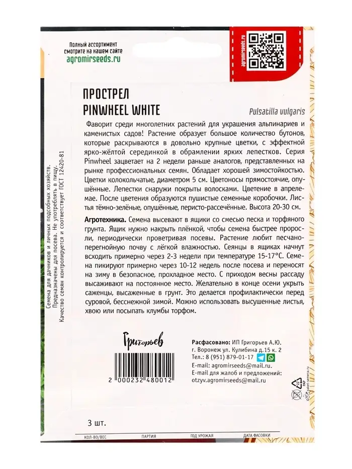 Семена цветов Прострел Pinwheel White 3шт. 12.29 г.