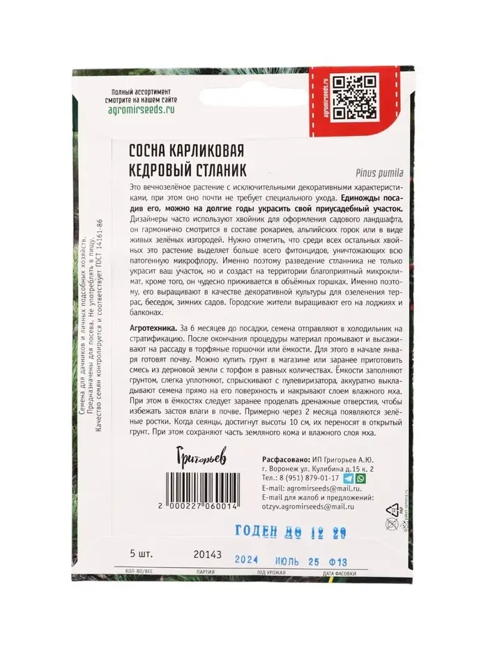 Семена цветов Сосна Кедровый Стланик карликовая 5 шт. 12.29 г.