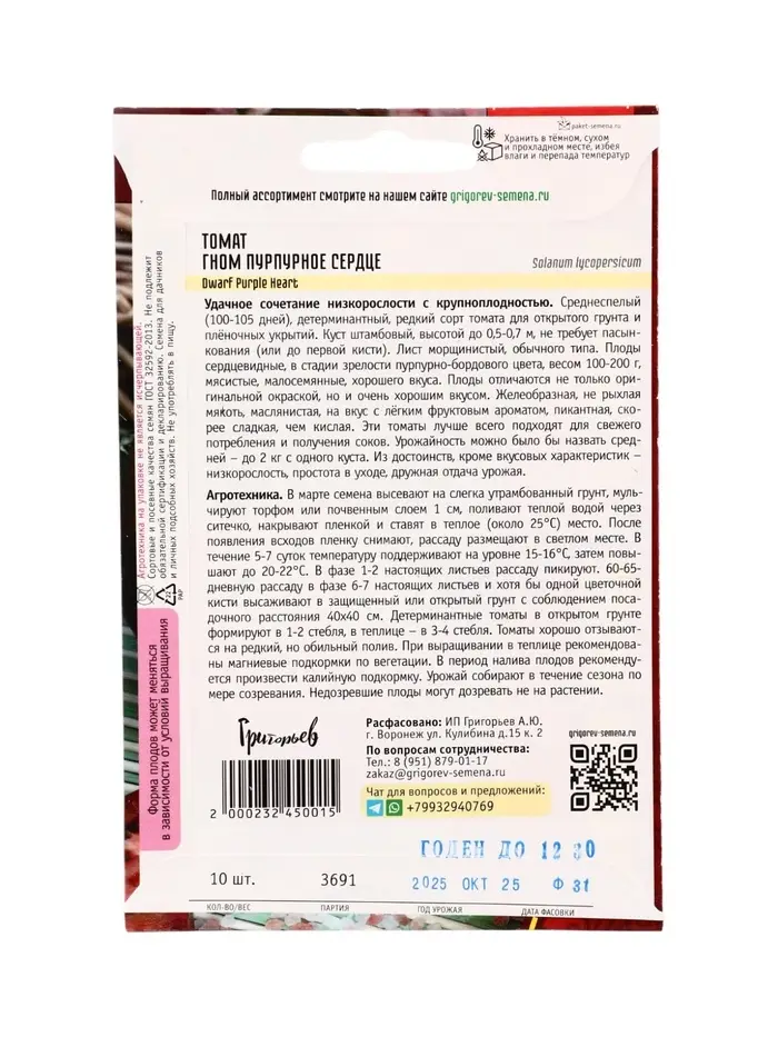 Семена Томат Гном Пурпурное Сердце (Dwarf Purple Heart) 10шт. 12.29 г.
