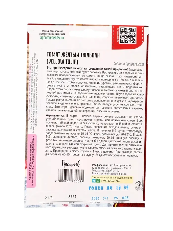 Семена Томат Жёлтый Тюльпан (Yellow Tulip) 5шт. 12.29 г.