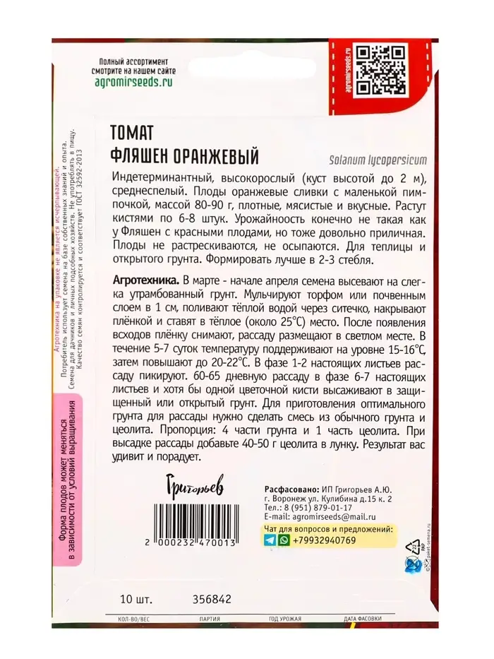 Семена Томат Фляшен Оранжевый 10шт. 12.29 г.