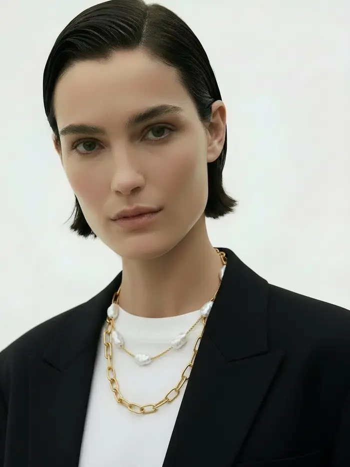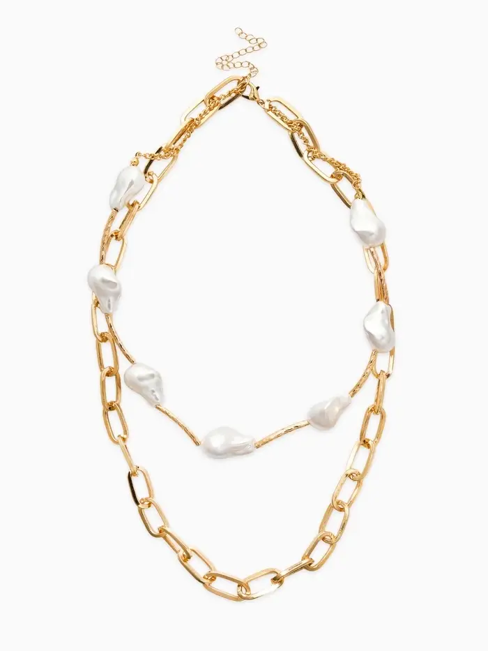 Колье "Жемчуг" борокко, цепь, 2 яруса, цвет белый в золоте