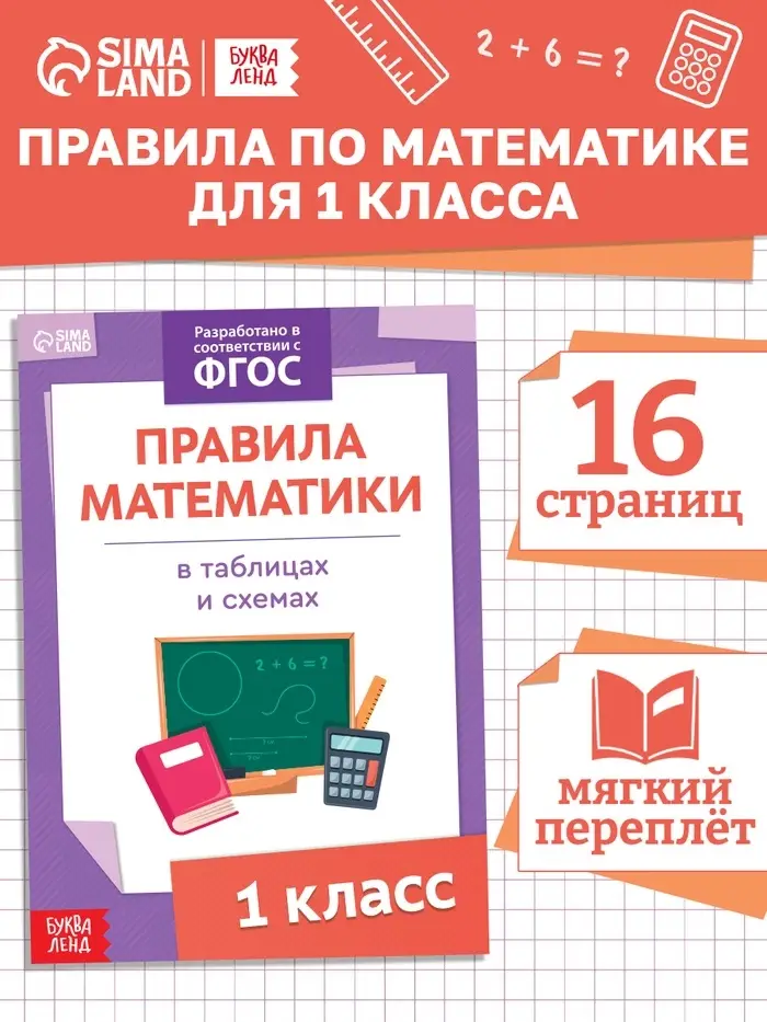 Книга «Правила математики» станет надёжным помощником для детей от 6 лет. Эти 16 страниц с наглядными схемами и таблицами помогут ребёнку освоить и повторить основные правила математики, изучаемые в 1 классе.