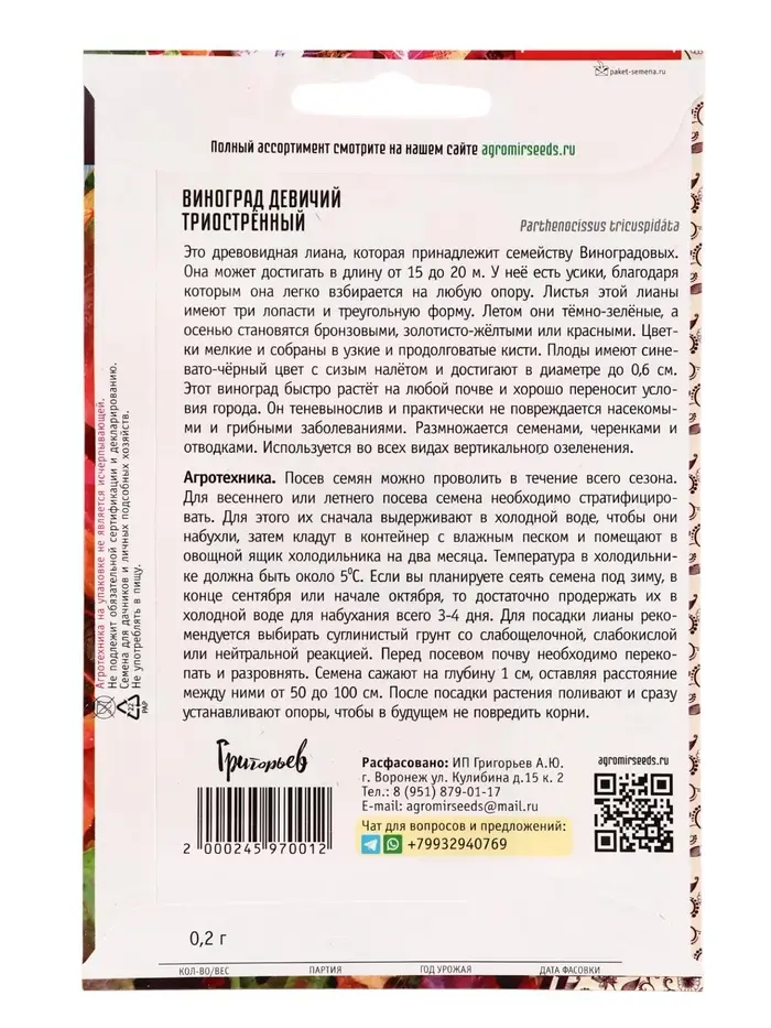 Семена Виноград девичий «Триостренный», 0.2 г, «Григорьев»