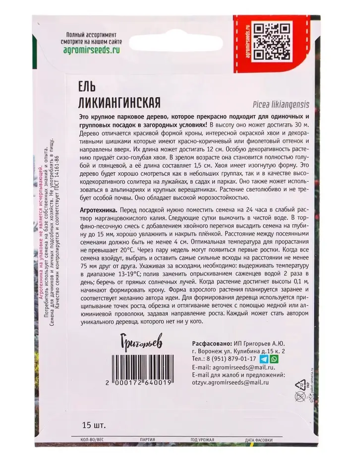 Семена Ель «Ликиангинская», 15 шт., «Григорьев»