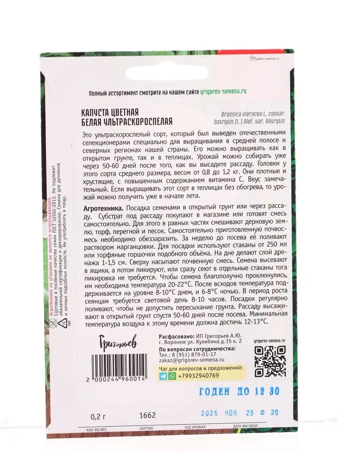 Семена цветов Капуста цветная Белая Ультраскороспелая 0,2г. 12.29 г.