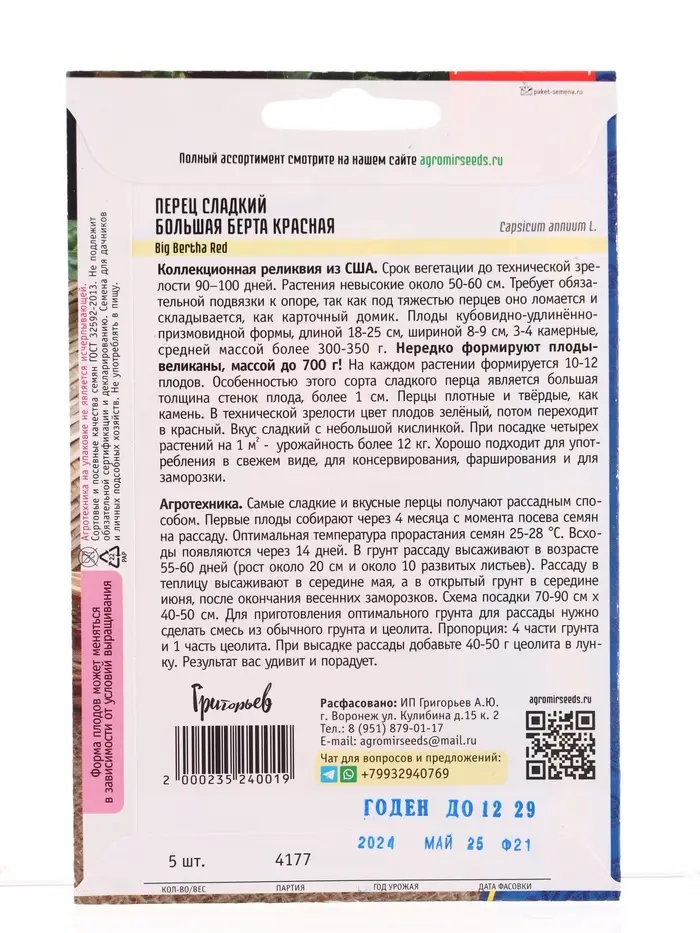 Семена Перец сладкий Большая Берта Красная (Big Bertha Red) 5шт. 12.29 г.