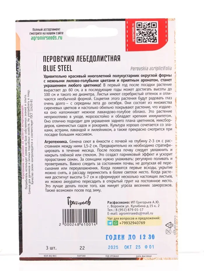 Семена цветов Перовския Blue Steel лебедолистная 3шт / НОВИНКА 12.29 г.