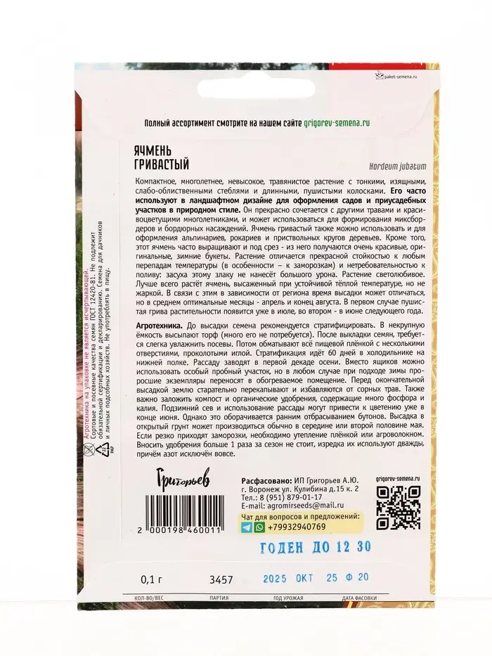 Семена Ячмень Гривастый 0,1г. 12.29 г.