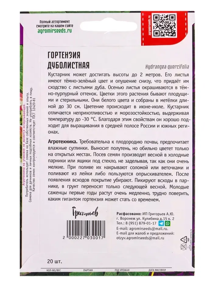 Семена цветов Гортензия Дуболистная 20 шт. 12.29 г.