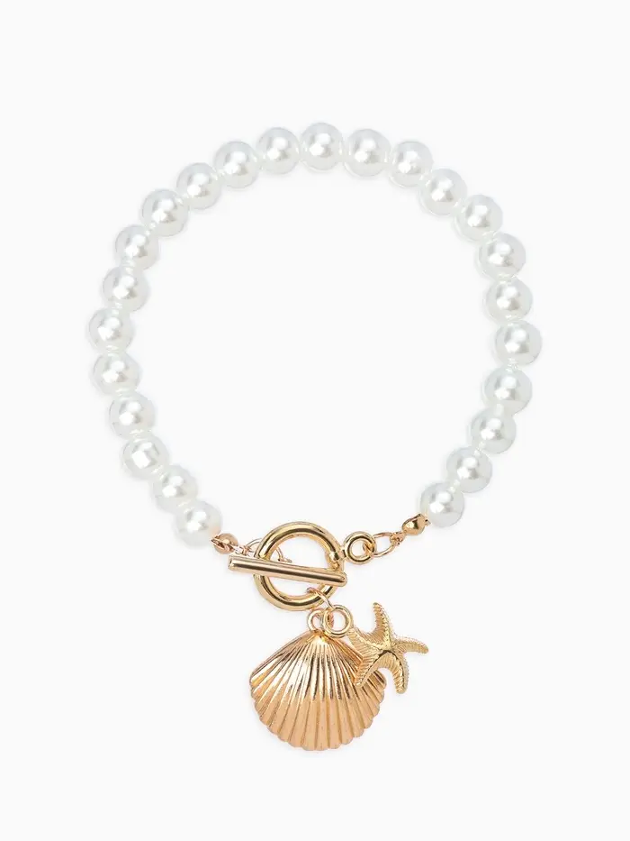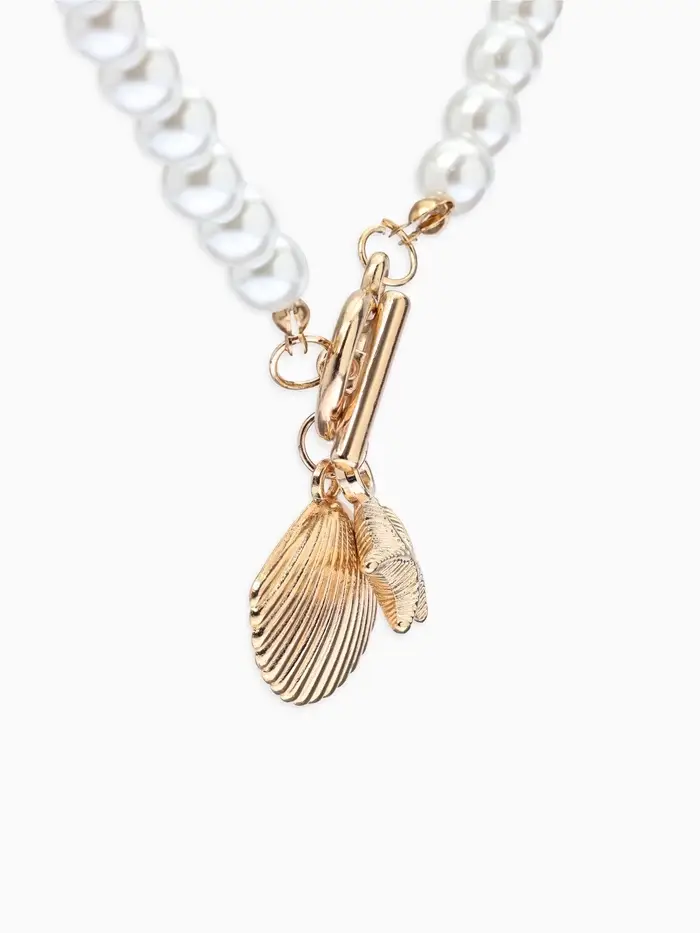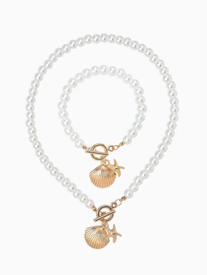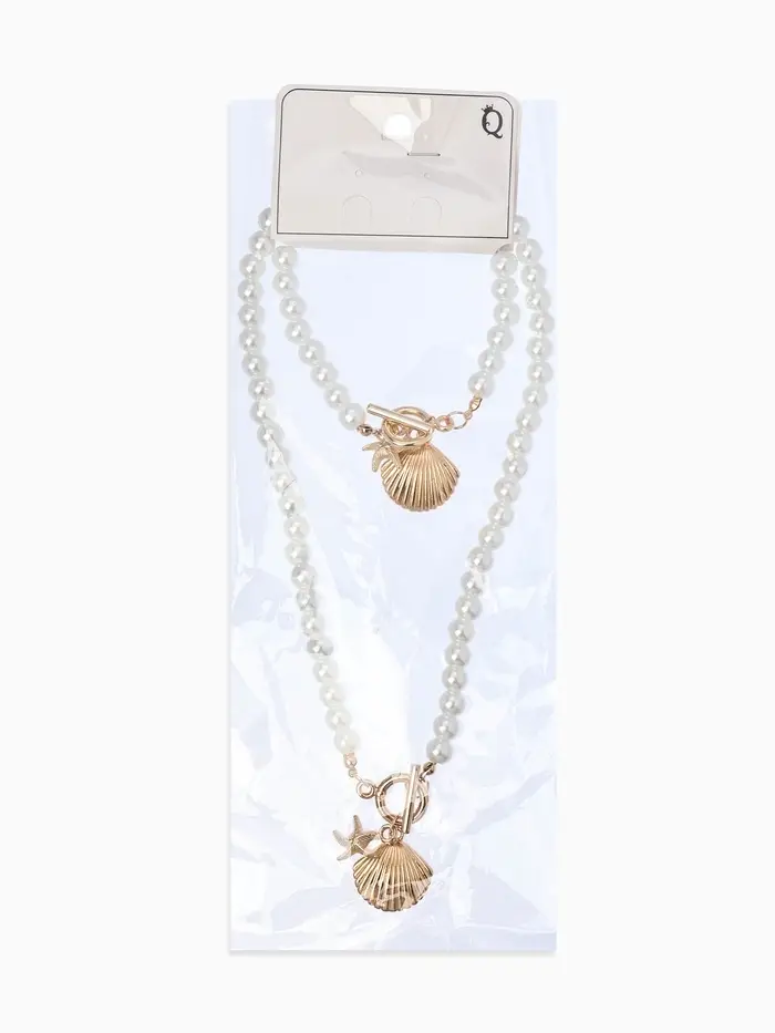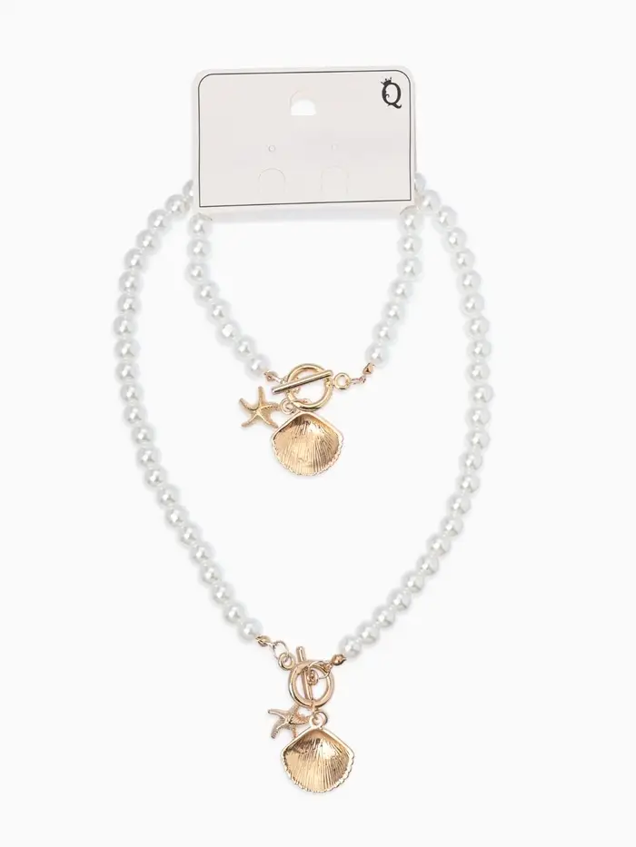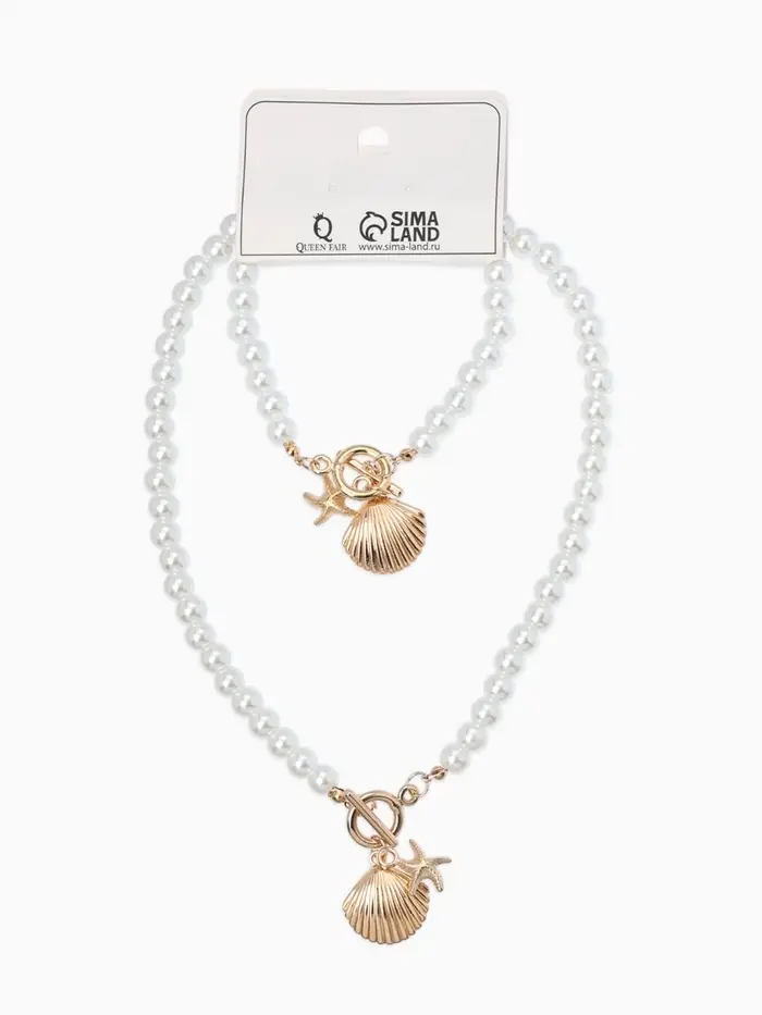 Набор 2 пред-та: бусы.браслет "Жемчуг", ракушка вонголе, цвет белый в золоте L=18/42см №8