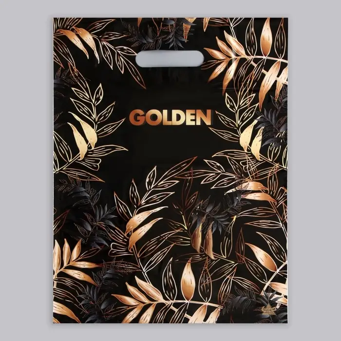 - Утончённый дизайн с золотым тиснением: Изысканный растительный узор на чёрном фоне выглядит строго и празднично одновременно. Такой пакет подходит для официальных мероприятий, деловых подарков и статусных презентов.