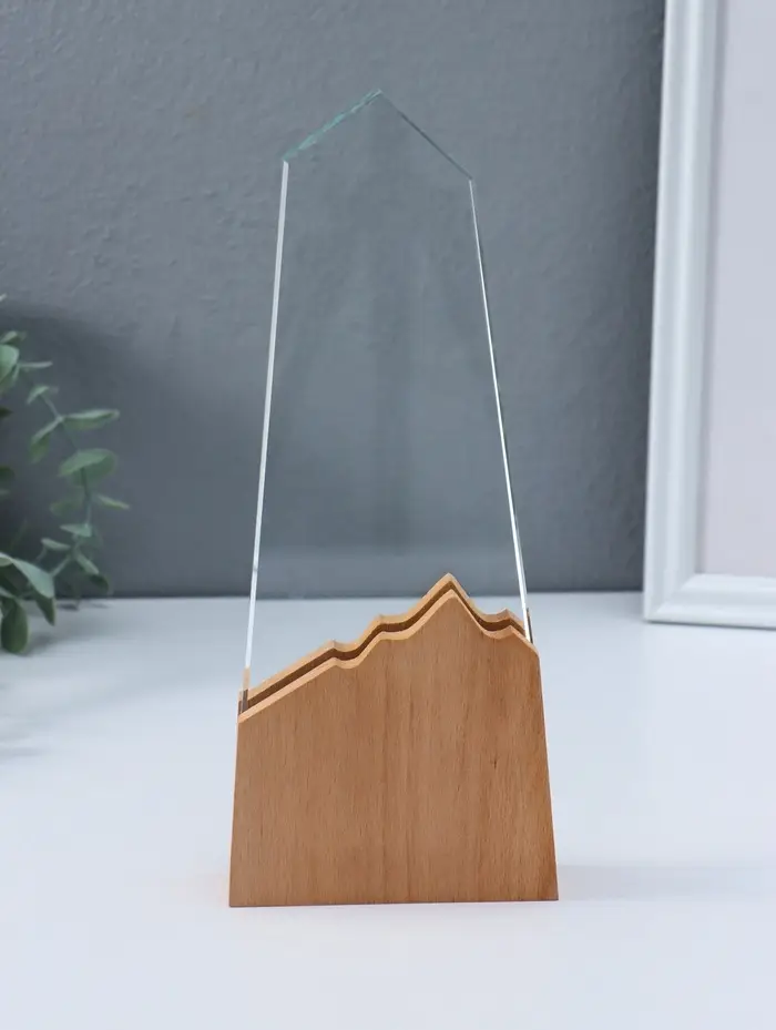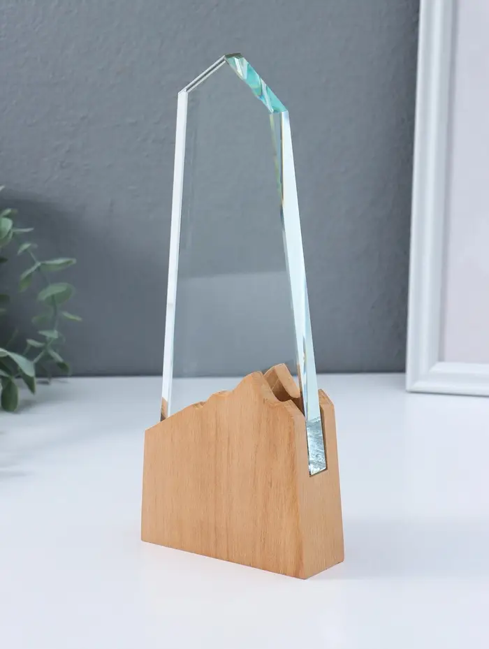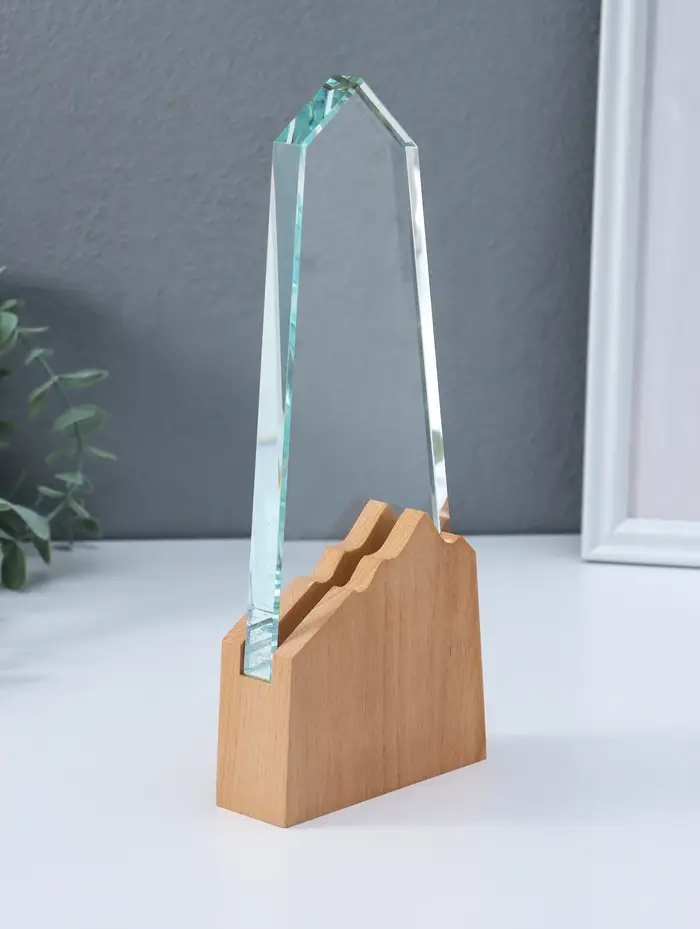 Стела наградная стекло, дерево "Гора" верх 18х8,5 см низ 10х10 см 3,5х10х25 см