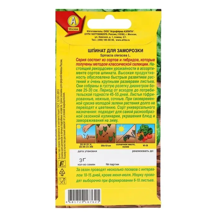 Семена шпината «Для заморозки» — отличный выбор для тех, кто хочет наслаждаться свежим и полезным шпинатом прямо с грядки круглый год. Средний срок созревания делает этот сорт особенно удобным для выращивания на открытом грунте в тёплые месяцы. От посева до сбора вкусного урожая пройдет совсем немного времени.