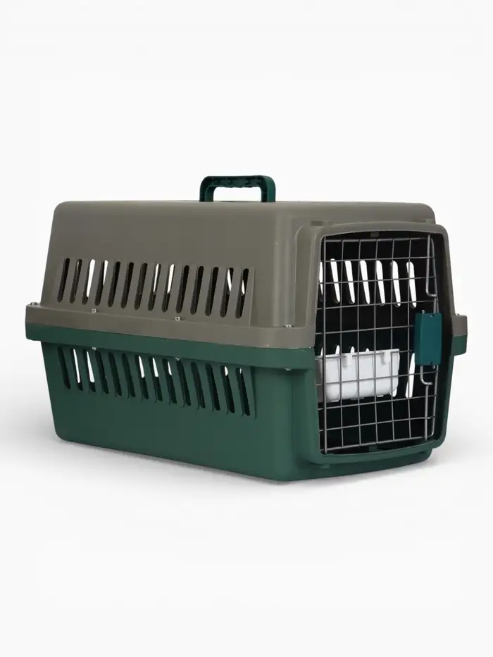 Переноска для животных пластиковая с сеткой и чашей 59 x 36 x 35 см, серо-зелёная
