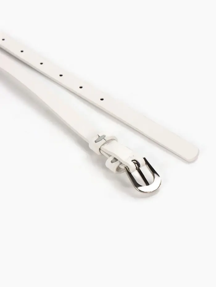 Этот тонкий женский ремень — лаконичный акцент, завершающий образ. Он мягко подчеркнёт талию, добавит стройности силуэту и соберёт воедино даже самый сложный ансамбль. Классическая серебристая пряжка и чистый белый цвет делают его универсальным спутником для брюк, джинсов, платьев и юбок.