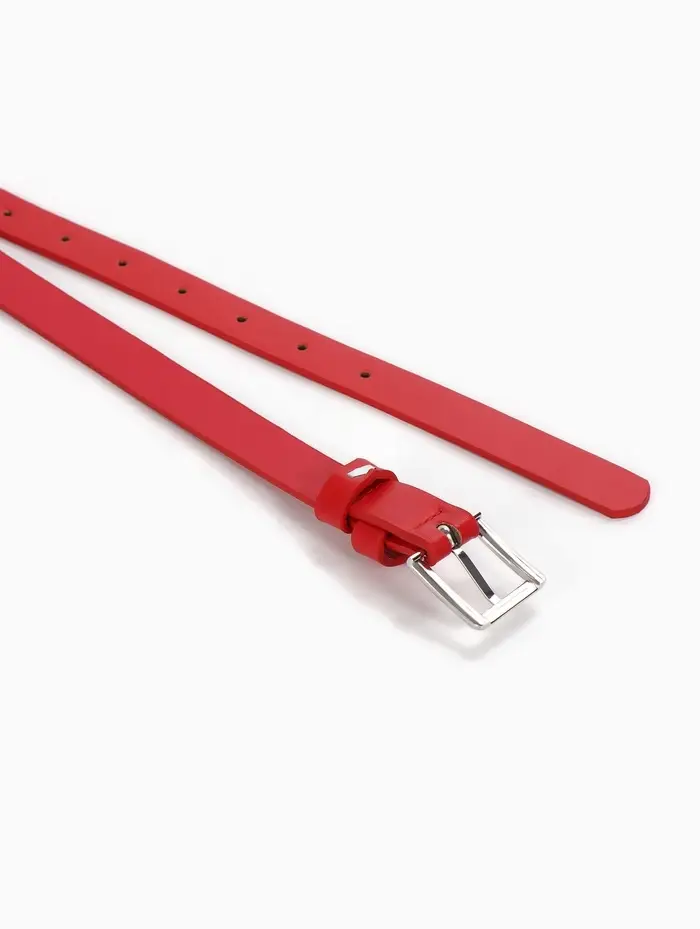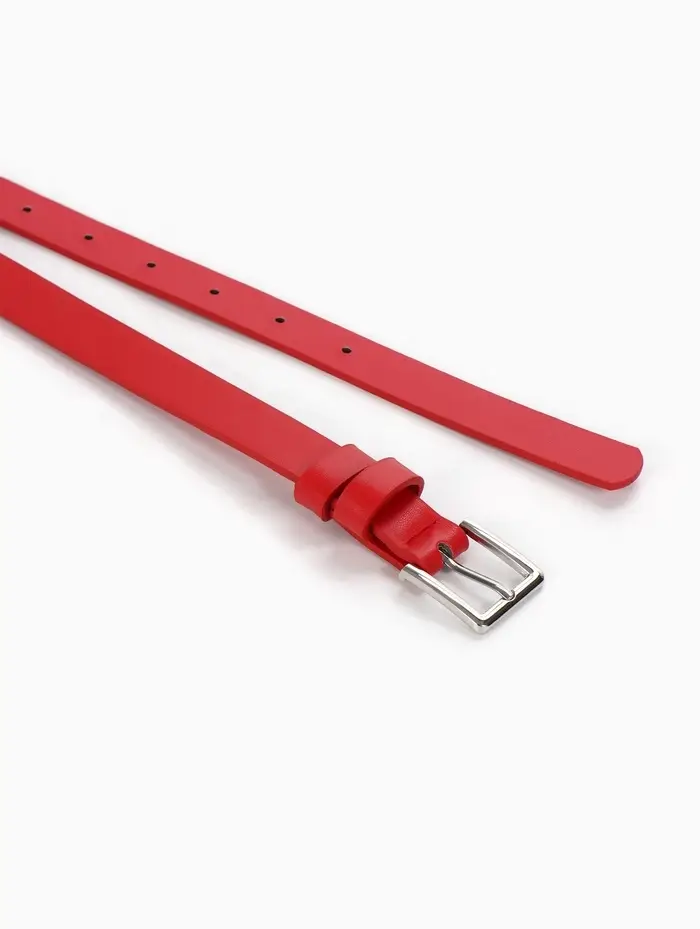 Этот тонкий женский ремень — акцентная деталь, завершающая образ. Он не просто удерживает брюки или юбку, а добавляет стилю чёткость и лаконичную элегантность. Классическая пряжка на одном проколе даёт точную регулировку и обеспечивает аккуратный силуэт.