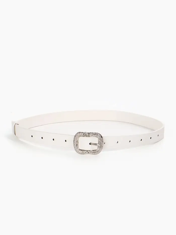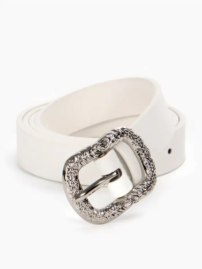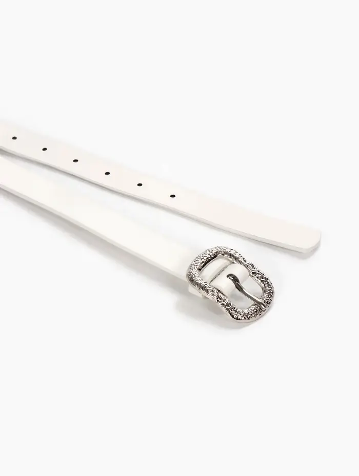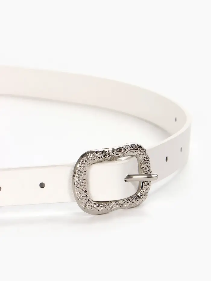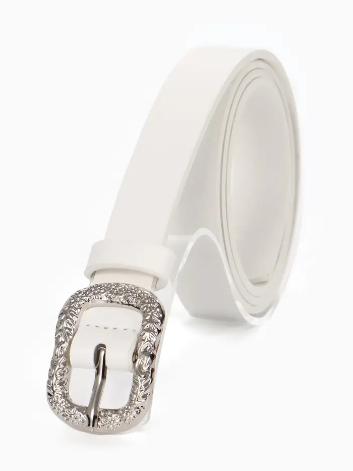 Белый ремень со серебряной фурнитурой — свежий штрих для светлых джинсов, льняных брюк или платья-рубашки. Он визуально вытягивает силуэт и оживляет монохромные комплекты. Простая и прочная пряжка обеспечивает комфорт в носке, а гладкая поверхность материала легко очищается от случайных загрязнений.
