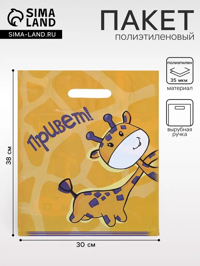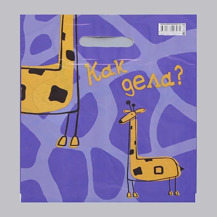 - Детский дизайн: Весёлые жирафы на оранжевом фоне создают настроение игры. Пакет особенно подходит для подарков детям — небольших игрушек, сладостей или канцелярии.