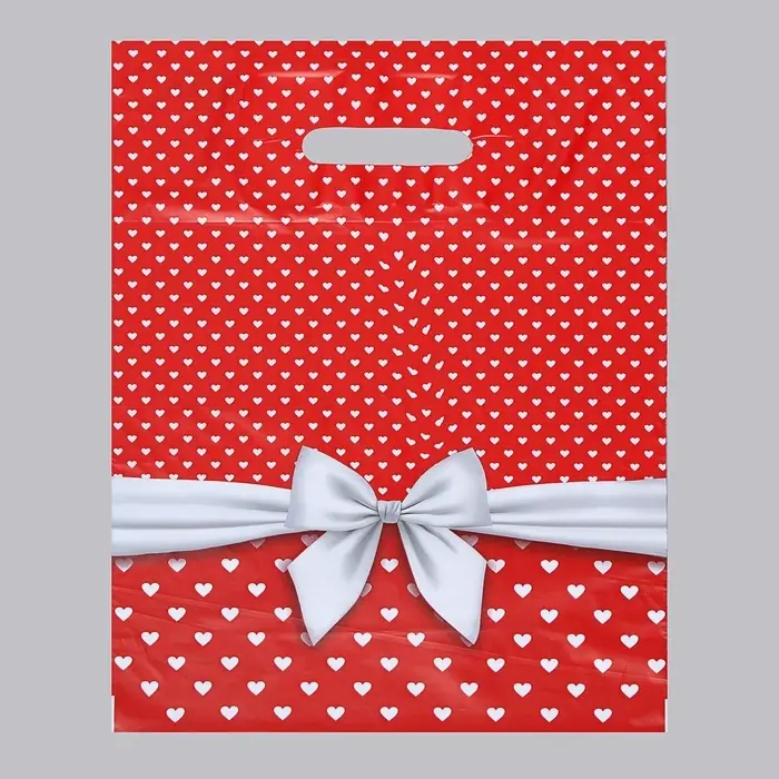 - Романтичный дизайн: Красный фон с узором из сердечек создаёт атмосферу нежности и любви. Пакет особенно подходит для подарков партнёрам — украшений, парфюмерии или любовных записок.