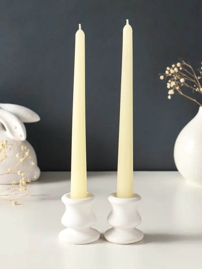 Этот набор из двух высоких свечей в цвете слоновой кости создаёт атмосферу утончённого торжества. Их классическая коническая форма и благородный бежевый оттенок делают их универсальным элементом декора для свадебной церемонии, романтического ужина или любого особенного момента. Каждая свеча горит до пяти часов, наполняя пространство мягким, живым светом без навязчивого аромата, чтобы ничто не отвлекало от праздника и общения.