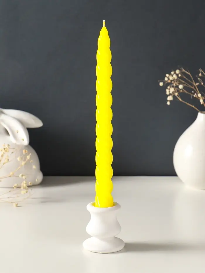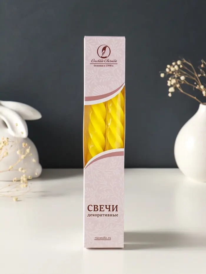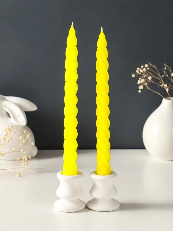 Этот набор из двух высоких витых свечей создаёт атмосферу уюта и торжества. Гладкие спирали парафина цвета солнечного света горят ровно и долго, наполняя пространство тёплым, живым светом. Универсальный жёлтый оттенок и классическая форма делают их идеальным элементом декора для любого повода — от романтического ужина до праздничного застолья.