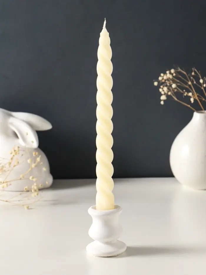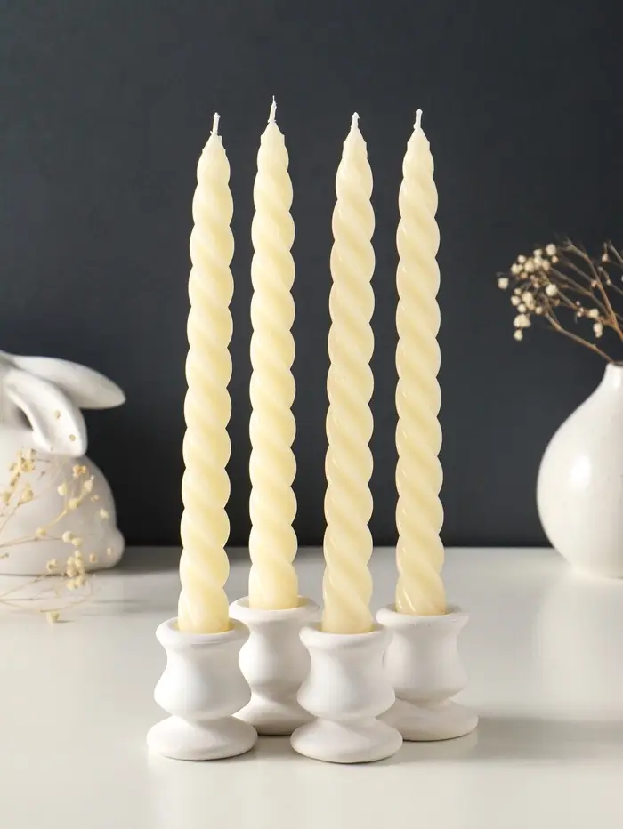 Этот набор из четырёх высоких витых свечей создаёт атмосферу торжественного спокойствия. Их классическая форма и благородный бежевый оттенок, напоминающий цвет слоновой кости, придают уют и элегантность любому пространству. Свечи горят до пяти часов, постепенно раскрывая свою изящную спираль, и идеально подходят для длинных вечеров.