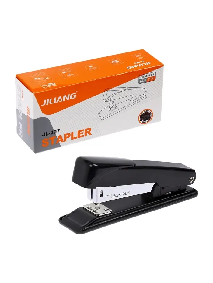 Этот металлический степлер чёрного цвета — надёжный инструмент для офисных и домашних задач. Модель №24-26/6 рассчитана на скрепление до 18 листов стандартной бумаги, что покрывает большинство повседневных потребностей: от подготовки документов до брошюровки рефератов. Совместимость с двумя типами скоб — 24/6 и 26/6 — обеспечивает универсальность и удобство использования. Прочный металлический корпус гарантирует долговечность и устойчивость к нагрузкам. Лаконичный чёрный цвет вписывается в любой офисный интерьер.