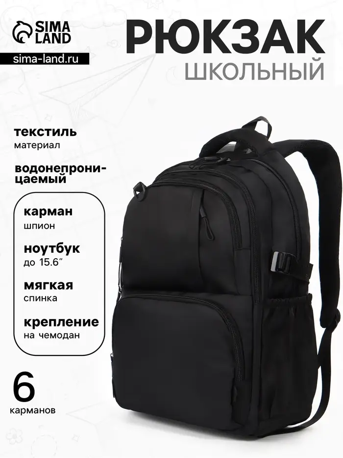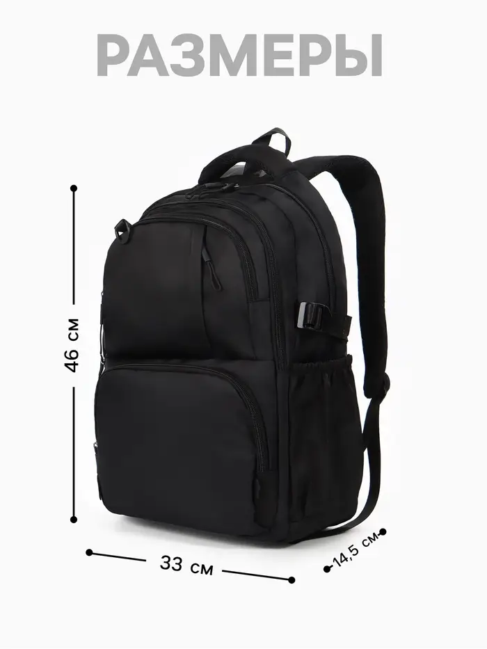 Рюкзак школьный, 33×14.5×46 см, 2 отделения, 6 карманов, чёрный