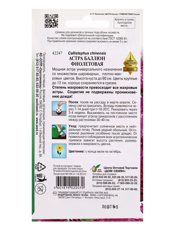 Семена цветов Астра Баллюн фиолетовая 30 шт