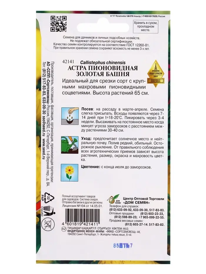 Семена цветов Астра пион. Золотая Башня 85 шт