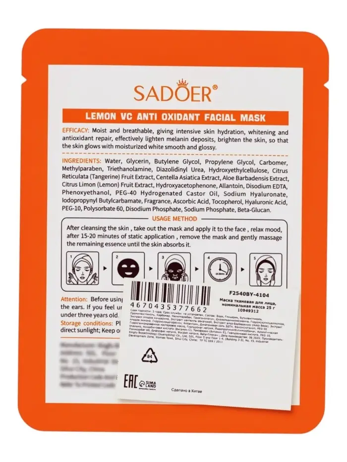 Маска тканевая антиоксидантная для лица с экстрактом лимона, 25 г