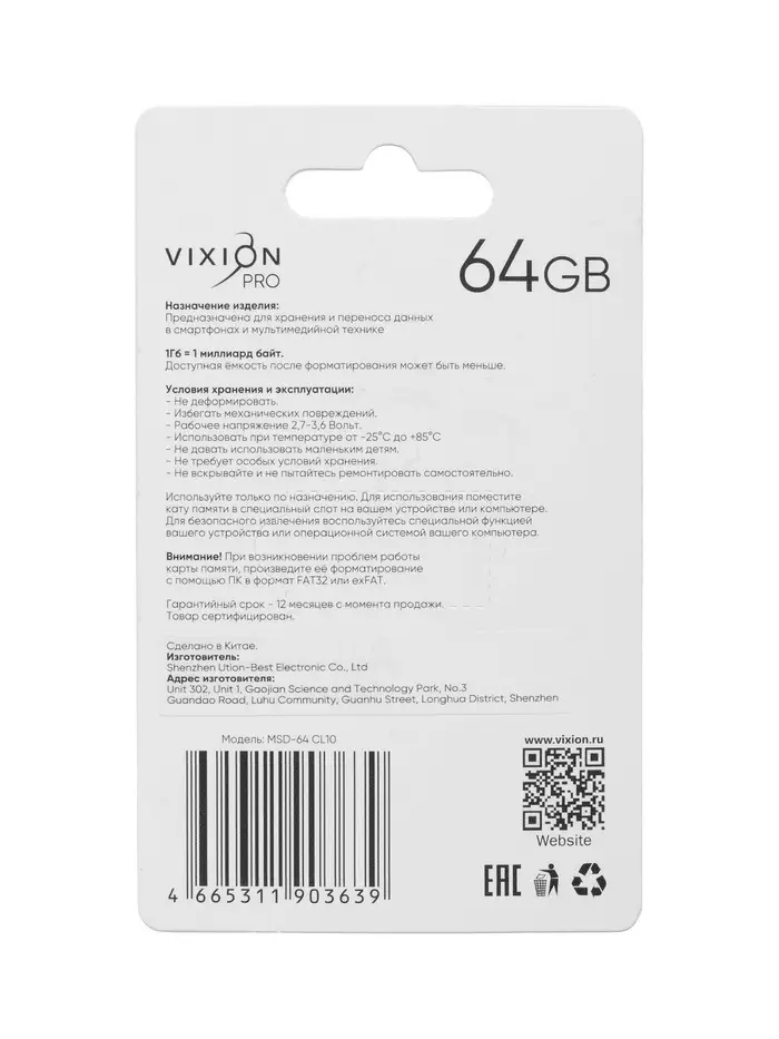 Карта памяти MicroSD VIXION PRO, 64 Гб, класс 10, без адаптера
