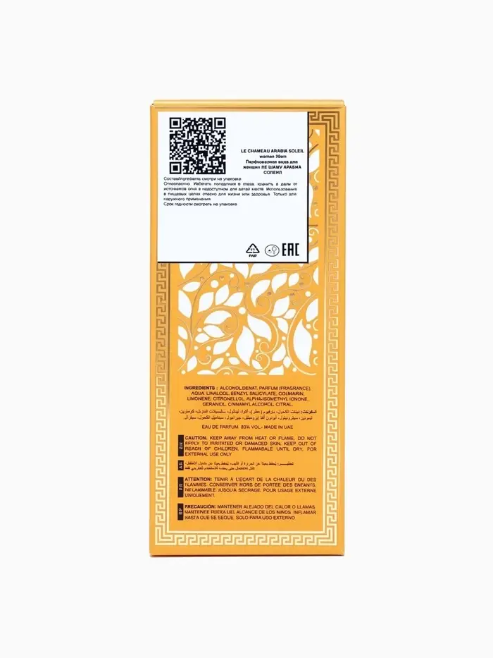 Парфюмерная вода Le Chameau ARABIA SOLEIL — это солнечный и женственный аромат, вдохновлённый мотивом Haya Soleil. Он сочетает в себе яркие тропические акценты, цветочную свежесть и мягкую, тёплую базу, создавая ощущение радости, лёгкости и элегантной женственности.